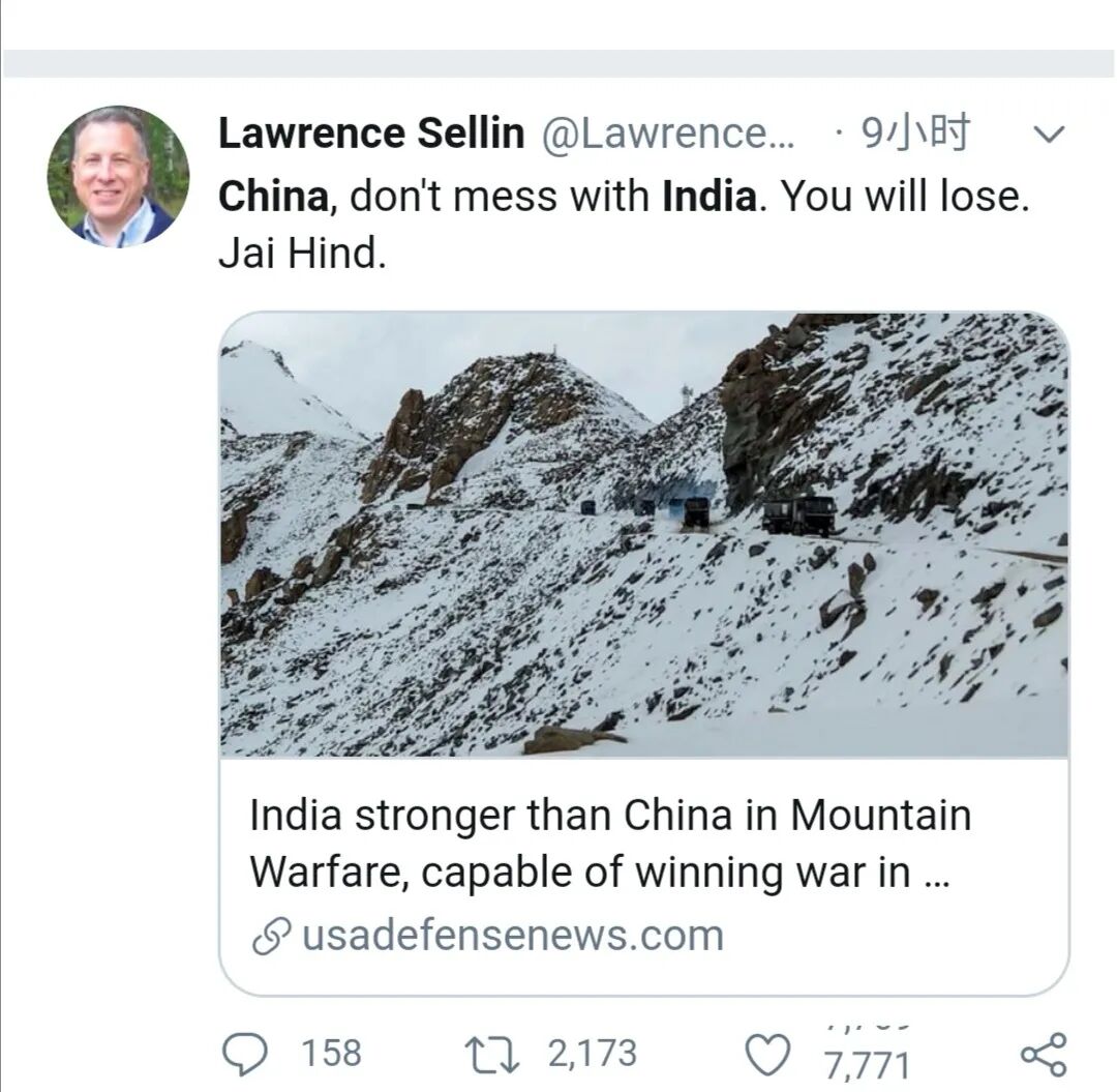 在Twitter上搜索“China India”,最火的帖子是美国退役陆军上校Lawrence Sellin转发的一条新闻——“印度在山地战中比中国更强大,可以赢得战争”。