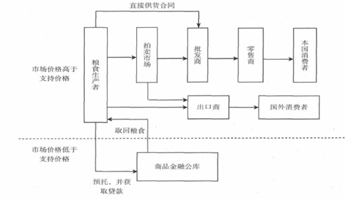 当粮食市价过低时,联邦政府委托商品信贷公司发放粮食贷款,以收存农户的剩余粮食为抵押,资金由政府拨给。