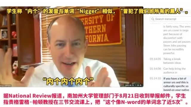 ▲由于帕顿的发音并不是标准普通话的“Na Ge Na Ge”,而是更口语化的“Nei Ge Nei Ge”,一些黑人学生便认为该教授是在故意用这个与英文中“黑鬼”(N**ger)近似的发音来侮辱他们