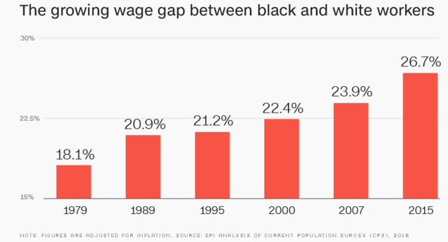 ▲据CNN Money文章,美国经济政策机构数据显示,美国黑人和白人工资之间的差距进一步拉大,创近40年以来的最大水平