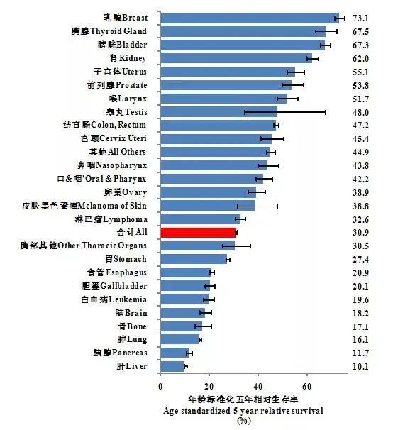 我国不同癌症的5年生存率↓