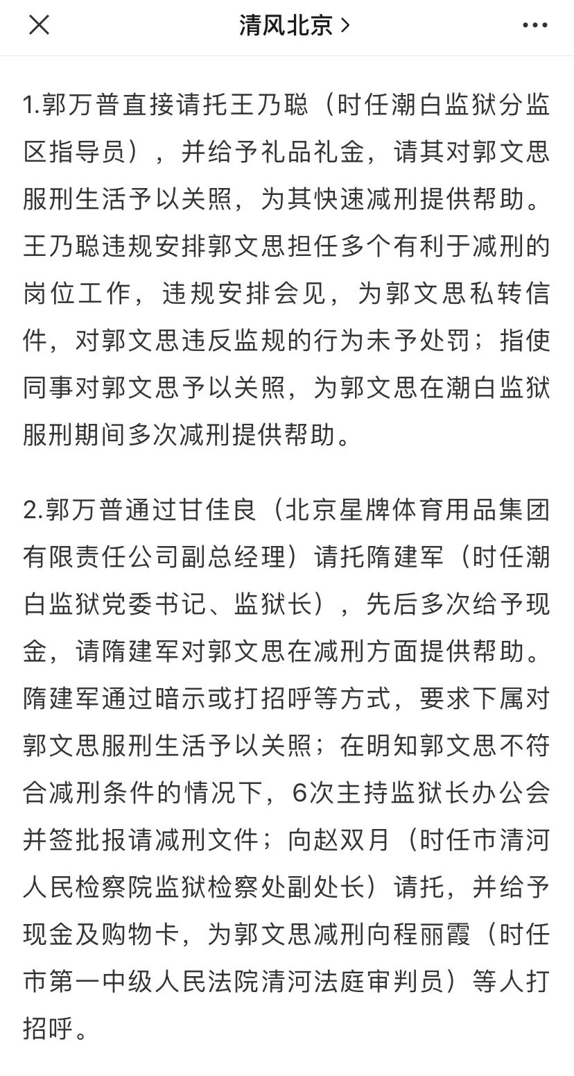 9月13日联合调查组通报显示,在郭文思服刑期间,其父郭万普(中国原子能科学研究院退休职工)动用了各种关系,砸上真金白银,“一步一个脚印”地为其子谋求减刑。