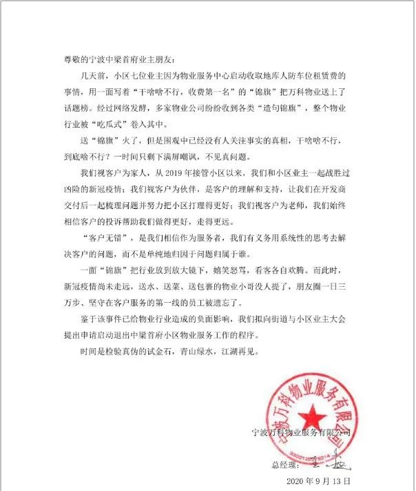 近期关于物业的一则新闻在网上登上热门,一时掀起巨浪。起因是宁波某小区几位业主给物业送了一面锦旗,上面写着“干啥啥不行,收钱第一名”,然后把锦旗拍照传上了网络,以此控告物业乱收钱行为。随后此事发酵,引来无数网友对物业的群嘲与谩骂。更有重庆网友效仿,也做了一幅同样字符的锦旗,敲锣打鼓送给了自己小区物业,成为坊间笑谈。我看一眼微博,几乎90%都是谩骂声,有的网友评论“真厉害,乱收钱害怕别人说?”“怎么跟小孩儿似的,说不干就干”“你不干,还怕别人不干吗?惯的……”知道的不知道的,一窝蜂群嘲这家宁波物业。昨天一个物业行业的朋友,对我说,自己小区也被连带了,这行是真他X的难干。我虽然一直以来都在帮助购房者维护权益,但是在真实了解过这次真相后,不得不对这家“撂挑子”的物业竖起大拇指:01