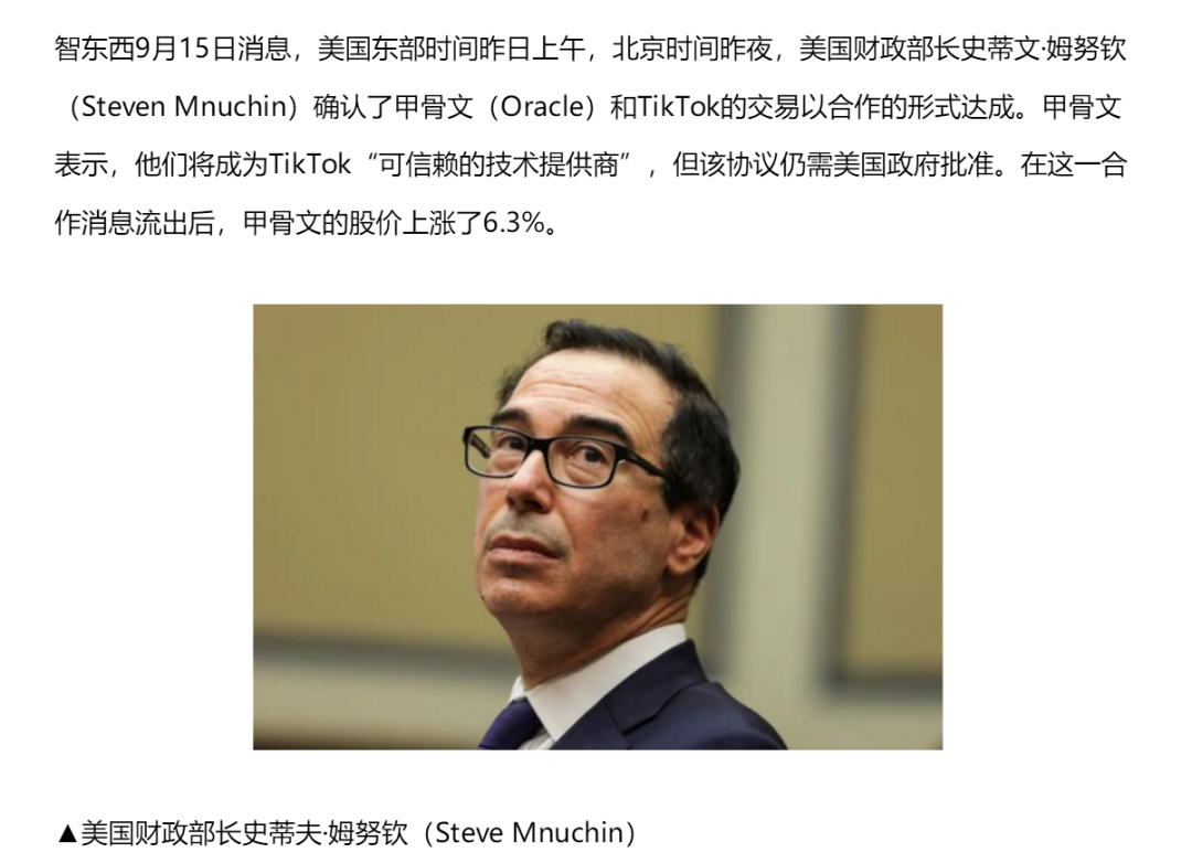 美国财政部姆努钦14日证实,本周将审查美国科技公司甲骨文和其他公司就改进(revamp)TikTok美国业务而达成的一项协议,以避免TikTok因外国所有权问题而被“封杀”。有知情人士称,如果协议获得批准,甲骨文将把TikTok的美国用户数据转移到甲骨文的云平台上。姆努钦于15日又确认了这一消息。