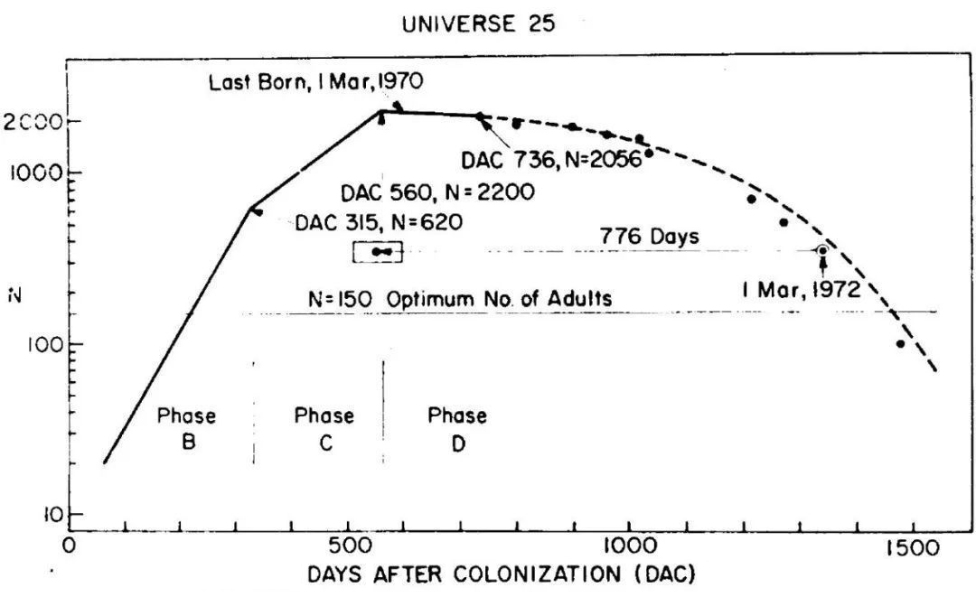 约翰·卡尔霍恩当时想,如果把老鼠放在一个物欲横流,但空间有限的理想乐园里,最终会出现什么结果?