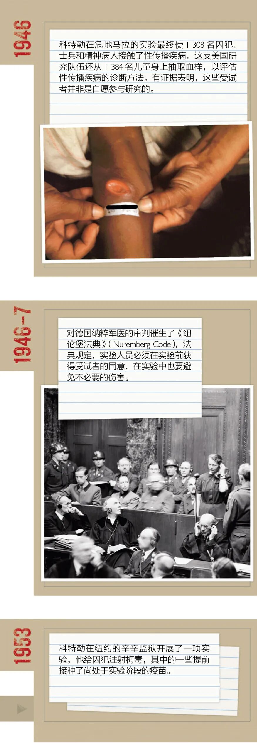 1946年末,科特勒已经开始危地马拉的工作,而在德国的纽伦堡,23名纳粹医生和军官接受了审判,罪名是第二次世界大战期间,他们在集中营里开展不人道的实验。这次审判催生了称为《纽伦堡法典》的一系列准则,它们规定,实验人员必须得到受试者的同意、受试者必须具有表达这种同意的能力,以及实验必须避免没有必要的身体和精神伤害。
