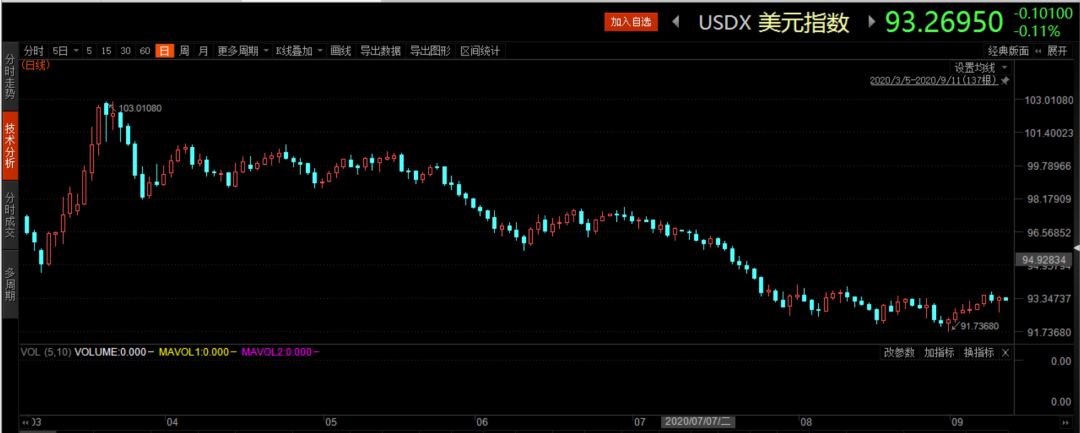 美元指数开始急跌。三月中旬之后,就开始一路下跌,从103最低跌至91.74。
