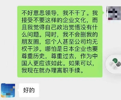 潜台词大概是这样的:你拿着日本人的钱,吃着日本人的饭,竟然在朋友圈给日本人找不痛快,是不是不想干了?