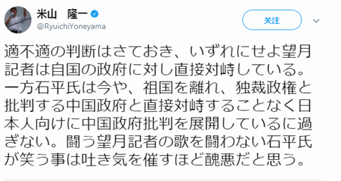 不管怎么说,望月她是在和自己政府作斗争。你石平身在日本,却只知道整天冲着日本人批判中国。缩头缩脑的石平反而说战斗着的望月“恶心”,我看你这种行为才更丑陋。