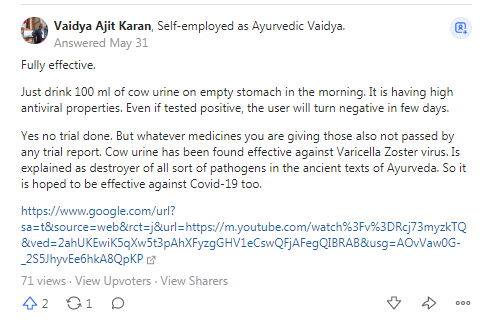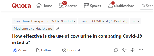 虽然在这之后也有科学家,甚至是印度的科学家表示,牛尿并不能用于治疗新冠肺炎,但还是有好事者在一些问答平台上煞有介事地提问:牛尿在印度抗击COVID-19上多有效?