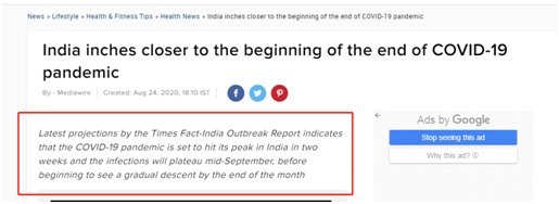8月24日,《印度时报》表示,“印度离COVID-19疫情开始结束又近了几英寸”。在其文章的开篇,该报称,印度“事实印度疫情报告”(Times Fact-India Outbreak Report)预测显示,“印度的COVID-19疫情将在两周内(即8月24日至9月4日前)达到高峰,感染将在9月中旬趋于平稳,到当月底开始逐渐下降”。