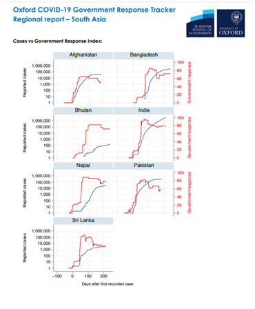 当然,在这篇文章的后半部分,《今日印度》虽未标明谁做得更好,但是言语中还是表示印度的封锁政策比其他国家做得更好。而我们也找到了印度媒体用以自夸的来自英国牛津大学的报告,其中提供了南亚各国应对疫情的指数变化,可供参考。