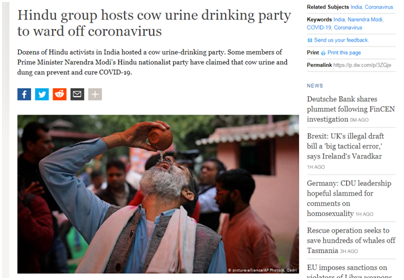路透社3月14日报道称,在印度首都新德里,一个名为“全印度印度教联盟”的组织曾举办了一个喝牛尿的聚会,因为他们相信这能预防新冠病毒。此前,印度总理莫迪所在的印度人民党主席阿米特·沙阿就曾主张,用牛尿作为癌症的治疗药物。