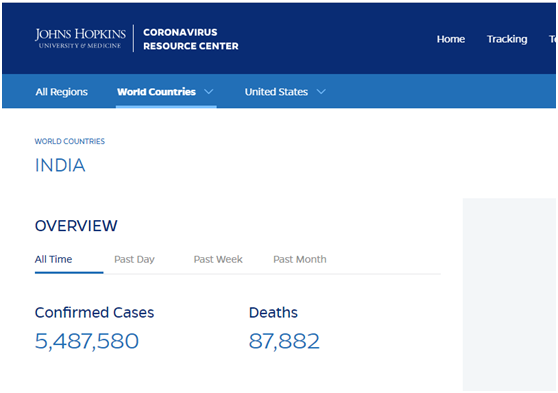 根据美国约翰·霍普金斯大学的数据(截至9月22日),印度新冠肺炎确诊病例已达548580例,死亡病例87882例,仅8月就新增近200万例确诊,28777例死亡。