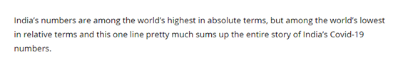作为一个维护印度“大国”尊严的媒体,自然是要为印度发声,可以理解。《今日印度》称,“在绝对意义上印度是全世界(新冠确诊)增长人数最多的国家,而相对意义上,印度的数字却是最少的,而这才是印度新冠疫情的全貌。”↓