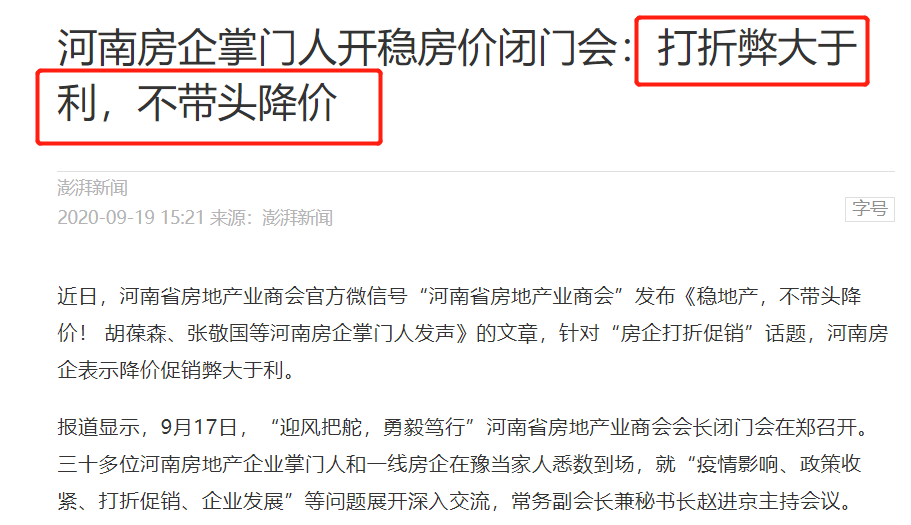 据澎湃新闻报道,近日,”河南省房地产业商会“微信号发文称,三十多位河南房地产企业掌门人和一线房企参加的闭门会中,多家房企表态稳地产,不带头降价。