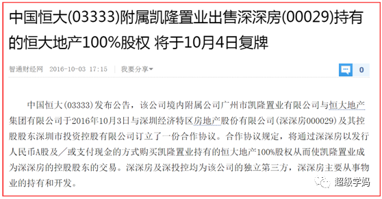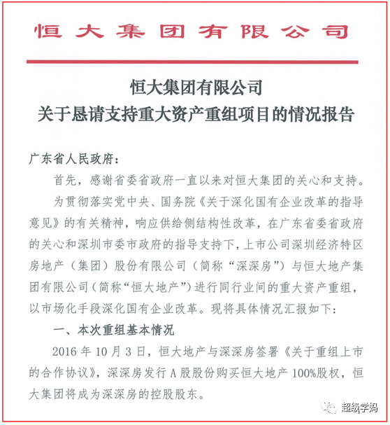 2016年10月3日,恒大地产与深深房签署《关于重组上市的合作协议》,深深房发行A股股份购买恒大地产100%股权,而恒大集团将成为深深房的控股股东。