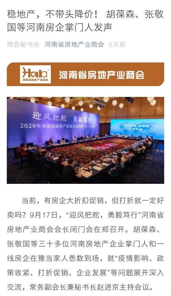 前些天,河南省房地产商会的会长们开了一个闭门会议。房地产商会是房地产企业的行业组织…嗯,是的,它是代表地产商的利益、为房地产企业发声的,商会的会长们自然就是房地产企业的一把手了。闭门会议开出了什么成效、得出了什么结论、发出了什么倡议呢?商会的官方公众号,把这次房地产商们的闭门隐秘会议内容透出来了:稳地价,不带头降价!河南房企掌门人发声。为什么不能降价?商会给出的理由是“降价促销对整个行业发展,弊大于利”。具体如下:1.会使得已购房者的资产缩水,可能导致部分人出现过激的维权行为,不利于社会稳定;2.房价大起大落,对金融业、建筑业、建材业、服务业等相关行业都将造成巨大影响,一损俱损;3.可能会造成一大批房企倒闭。一旦倒闭,会导致烂尾楼不断增加,且资金链断裂可能致使债务危机爆发。4.消费者普遍存在买涨不买跌心理,即使降价,房企业难达到预期目标。