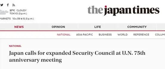 据环球网转引日媒《日本时报》的报道,9月22日(纽约时间9月21日)在联合国成立75周年的纪念峰会上,日本外务大臣茂木敏充的发言视频中,茂木敏充呼吁改革联合国安理会,日本以75年前联合国的制度设计未能完全实现《联合国宪章》的目标为由,要求成为联合国安理会常任理事国。