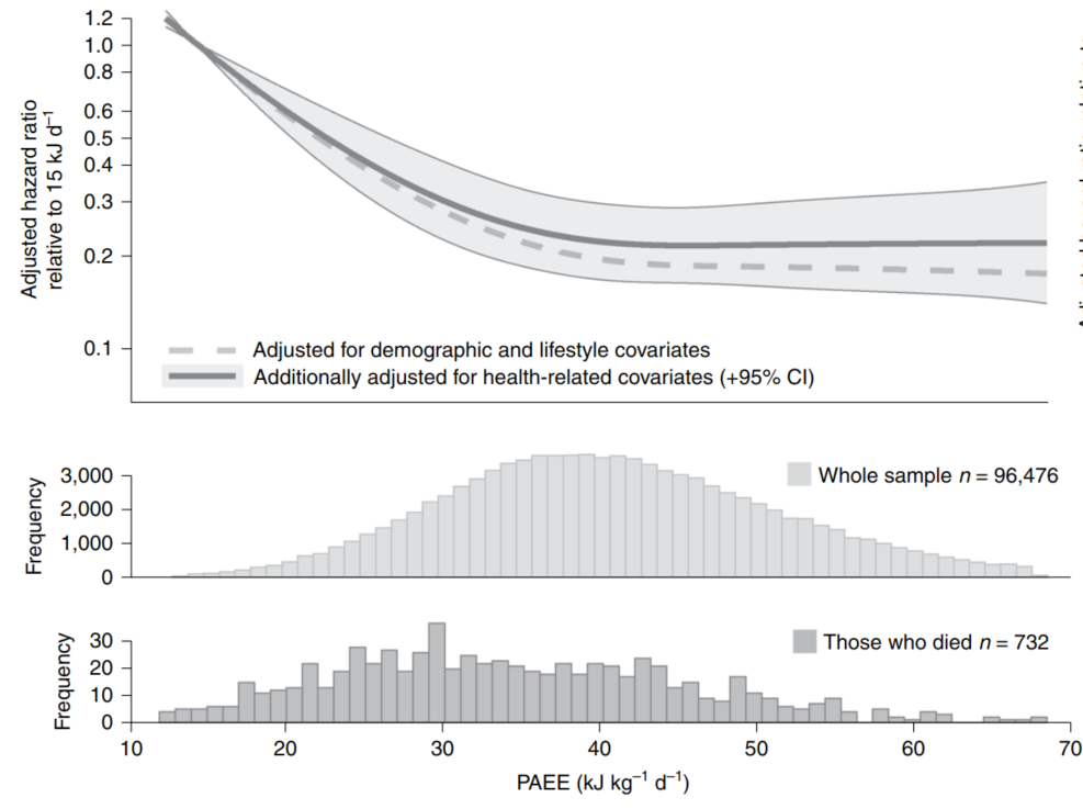 在平均3.1年的随访期间,共732人死亡。排除随访第一年死亡,并考虑糖尿病、心脏疾病和癌症等可能影响活动的基础疾病因素后,研究人员分析了身体活动水平(包括强度和总量)与死亡风险的关联。