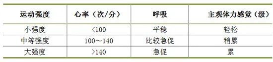 运动强度可划分为小强度、中等强度和大强度三个级别。监测运动强度的指标有运动中心率、运动中呼吸变化和运动中自我感觉等。