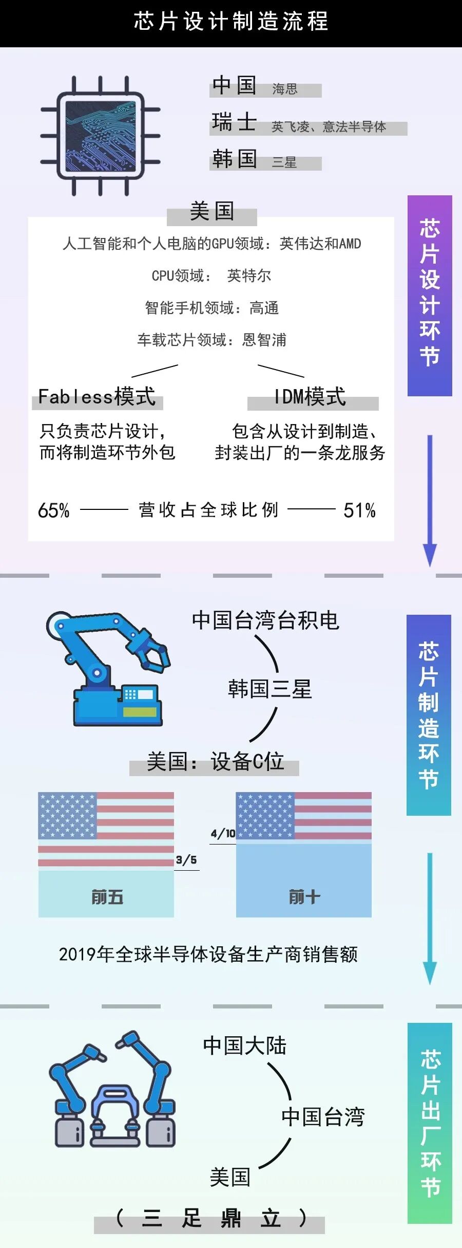 ▲ 滑动查看芯片设计制造全流程中各国位置