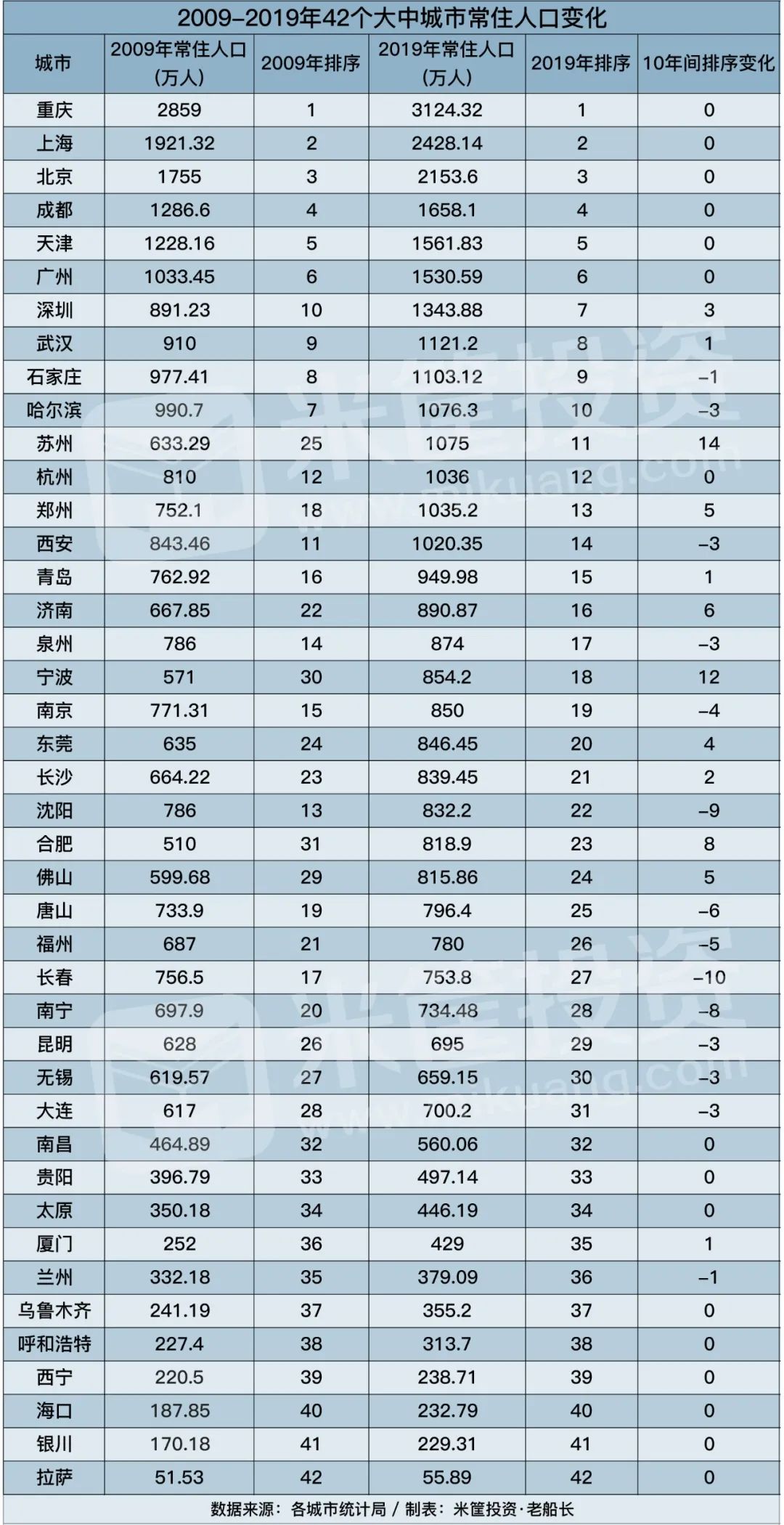根据各城市的2019年统计数据,常住人口超过千万的城市多达14个。其中,重庆人口超过3000万高居第一,但由于重庆面积实在太大,已经不能当成一个城市来看待了。要知道,传统意义上的重庆主城9区的常住人口规模,也不过800多万人。而按照2020年扩容后的主城21区来算的话,重庆主城的常住人口规模达到了2027万人,仅次于上海、北京,排在全国第三。上海、北京常住人口规模超过2000万,位居第二档。成都、天津、广州的人口规模超过1500万,位居第三档。此外,还有深圳、武汉、石家庄、哈尔滨、苏州、杭州、郑州、西安8个城市的人口超过1000万,位居第四档。而与2009年相比,42个城市中有11个城市的人口排名实现上升,16个城市的排名没有变化,15个城市的人口排名下降。其中,苏州由2009年的633万增长到2019年的1075万,排名上升14位为最高。宁波也爬升12个位次,是排名上升第二多的城市。两座依靠加工制造业的城市,招工量需求居高不下,人口吸引力也稳步上升。