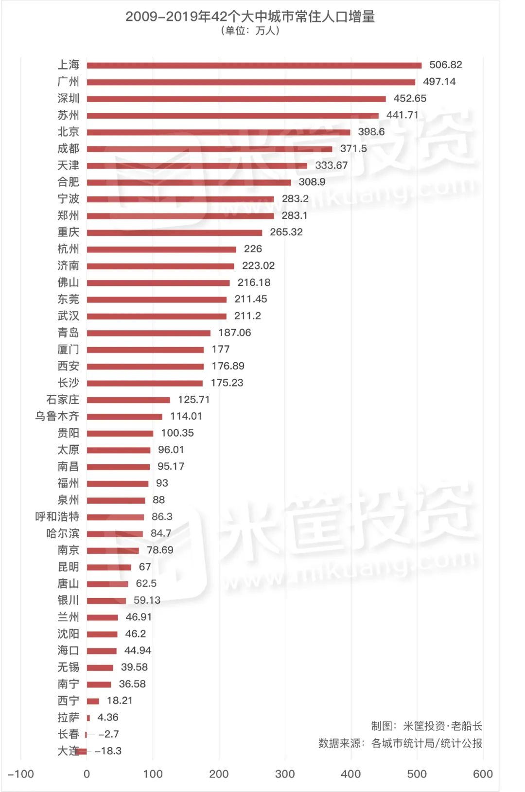 上海10年间增长506万人,高居全国第一,平均每年增长50万人,见证着这座“魔都”的扩张。近两年上海开始控制人口规模,常住人口出现下降趋势。压力之下,上海也开始从放开高校落户突破人口困局。广州增长497万、深圳增长452万、苏州增长441万分列二三四位,平均每年增长40多万的增速,也十分恐怖。而可怕的是,广州、深圳依然保持着这个速度,2019年广州新增40万、深圳新增41万,依然位居全国前三,广深的魅力无可阻挡。北京、成都、天津、合肥4个城市的人口增长都超过了300万,位居第三档。北京自不必说,成都、合肥的快速增长,则代表着中西部城市的崛起。此外,还有宁波、郑州、重庆、杭州、济南、佛山、东莞、武汉等8个城市的人口增长超过了200万,位居第四档。而这8个城市,正是强二线城市最有力的代表,有郑州、杭州、济南、武汉等省会城市,也有佛山、宁波、东莞等省内经济强市。青岛、厦门、西安、长沙、石家庄、乌鲁木齐、贵阳等7个城市的人口增长超过了100万,位居第五档。西安虽然增长了176万人,但成绩大部分还要归属于2017年之后开启全国“抢人”的政策。2018年,西安常住人口增加38.7万人,首次突破1000万人。但到了2019年,常住人口增量下滑到了19.98万人,增量几乎打了对折,增长态势并没有得到延续。另外还有17个城市实现人口正增长,但10年间未能超过100万人。而长春、大连两个东北城市,更是呈负增长状态。尤其是大连,10年间人口流失近20万人,只能垫底。从区域划分来看,人口增量前10名中,南方城市占了7个,除了成都位于西部,其他6个城市全部位于珠三角和长三角城市。而北方只有北京、天津、郑州3个城市。南北经济的失衡,人们直接用脚投了票。