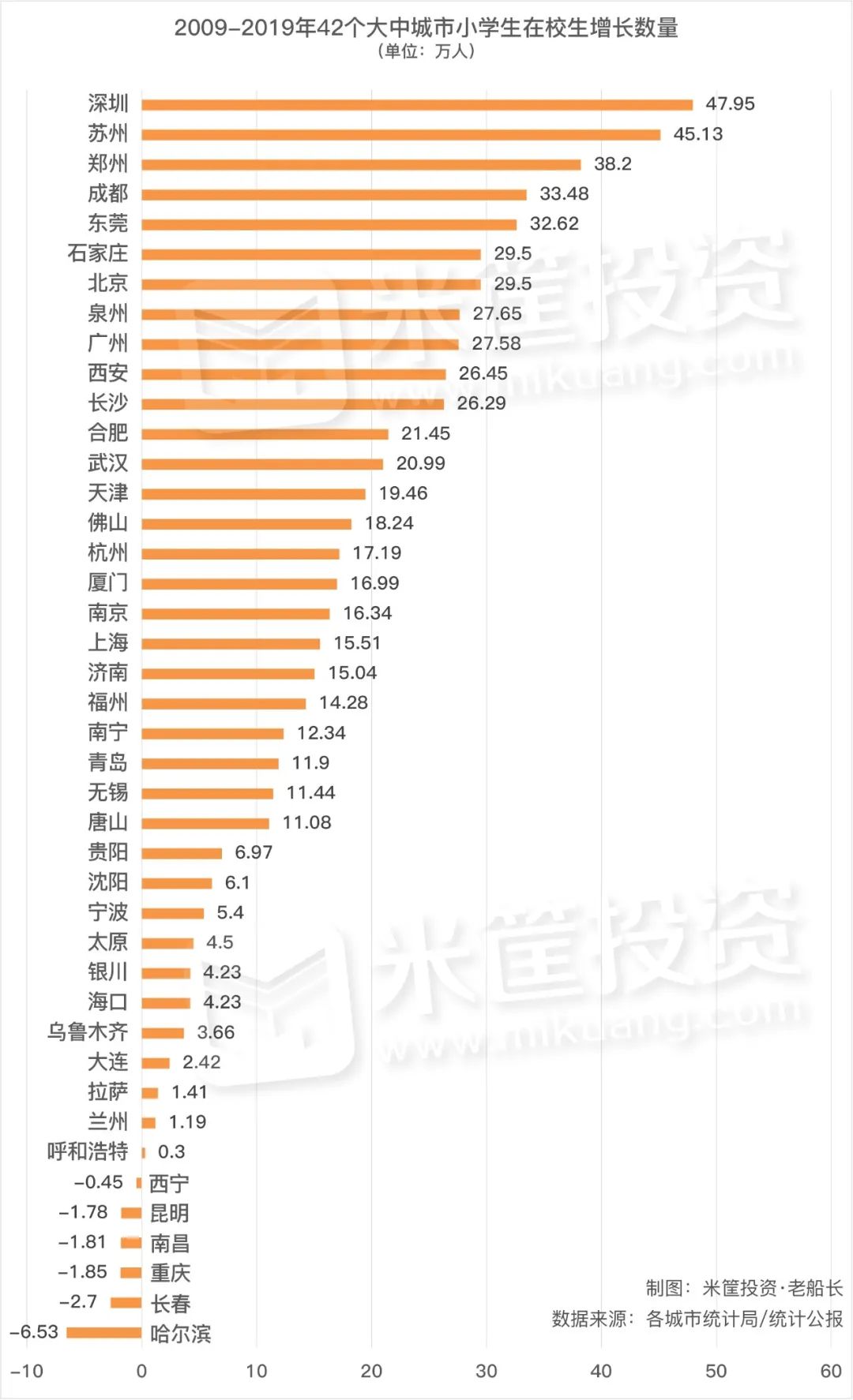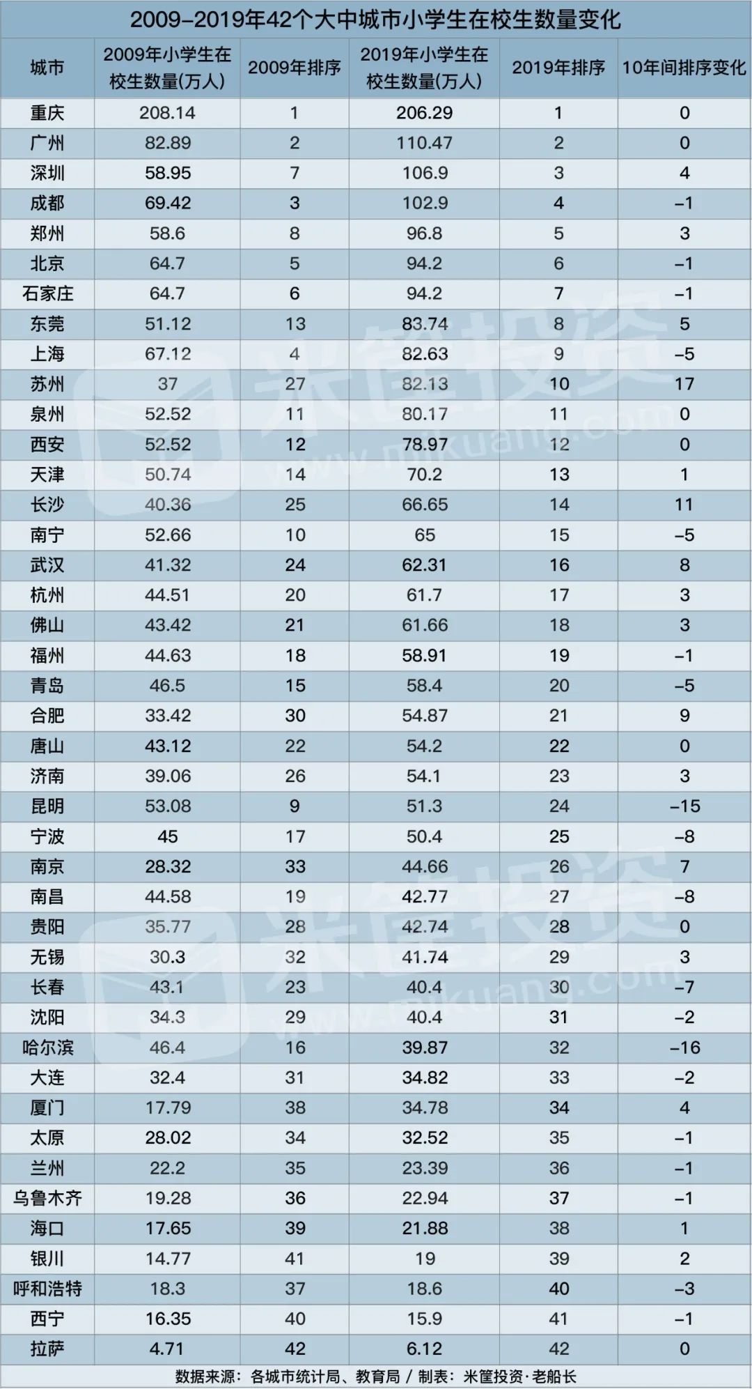 其中,厦门增长70%高居第一,厦门人口基数小,故而增幅较高。苏州、合肥的增幅都超过了60%,而深圳的增幅也超过了50%,这几个南方城市,显然也是这10年间的经济增长代表城市。而增幅前10名中有7个南方城市,再次印证人口向经济强的大城市流动,是趋势所在。观察人口吸引力的另一个强有力的佐证指标,便是小学生在校生数量。小学生数据来自教育部门,准确度和可信度都高,不仅代表着城市的未来人才潜力,也代表着背后的家庭对城市的信任。而一个小学生的父母,正处于生产力最旺盛的人生阶段,也是对城市发展的贡献效率最高的阶段。