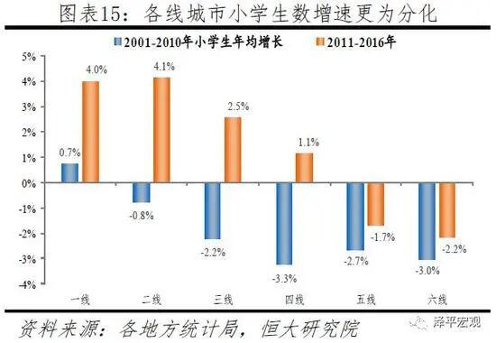 其中,深圳、苏州的小学生数量增长,是仅有的两个超过40万的城市,高居第一、第二,也侧面印证了两个城市的经济实力与发展速度。郑州、成都、东莞3个城市的小学生在校数量增长都超过了30万,位居第二梯队。三个城市的人口吸引力很强,但来源并不相同。郑州、成都的增长,大多来自省内人口流入,而东莞则依靠四川、湖北、河南等务工大省的外来人口支撑。在2020学年东莞的83万在校小学生中,非东莞户籍的小学生多达61万,占了73%。石家庄、北京、泉州、广州、西安、长沙、合肥、武汉等8个城市的增长都超过了20万,增长势头也算不错。而贵阳、沈阳、宁波3个城市的在校小学生数量增长没能超过10万,太原、银川、海口、乌鲁木齐、大连、拉萨、兰州、呼和浩特的增长没能超过5万。西宁、昆明、南昌、重庆、长春、哈尔滨等6个城市的在校小学生数量甚至出现了负增长。10年间,哈尔滨的在校小学生数量下滑了6.5万人,但哈尔滨的常住人口却增加了84万,意味着生育率的大幅下滑,东北整体的情况不外乎如此。2001-2010这10年间,仅有一线城市实现了0.7%的正增长,二三四五六线城市均为负增长。而到了2011-2016这5年,一二线城市却取得了4%左右的增长,三四线的增速回正,五六线城市的小学生数量依旧在下滑。只不过小学生的分化,预示着小城市和大城市的未来差距,只会越拉越大。
