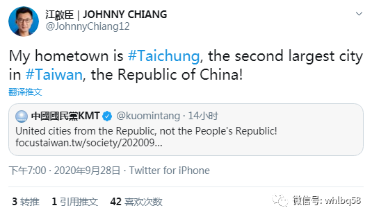 昨天(28日),中国国民党主席江启臣在推特用英文发文,称“台中是我的家乡,是台湾的第二大城市,中华民国!”