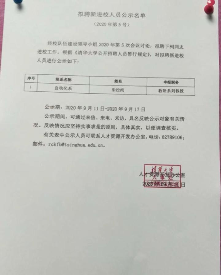 最近,清华大学的一则《拟聘新进人员公示名单》火了,名单中显示,朱松纯将回国入职清华大学自动化系,职务为科研系列教授。