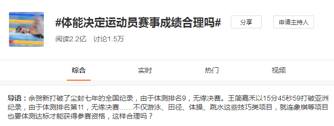 27号晚上举行的女子1500米自由泳预赛中,王简嘉禾以15分45秒59的成绩打破亚洲纪录,但是在赛后采访中王简嘉禾透露,因为体能测试中成绩不达标,自己无缘该项目决赛。男子选手余贺新以21秒79获得男子50米自由泳预赛第一,刷新了该项目尘封7年的全国纪录,但也无缘决赛。她们无缘决赛的原因,就是体能测试成绩不达标——未进入预赛选手前8。