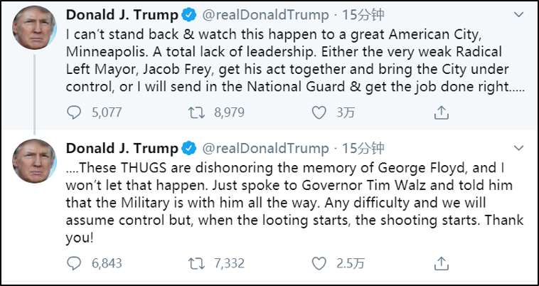 再看看在位的特朗普,没有下跪,也没有任何福利承诺给黑人同胞。只是在社交媒体上表达了对逝者的哀悼以及对镇压暴乱的警察表示尊敬,同时,也反复强调会用军事手段来稳定社会治安。