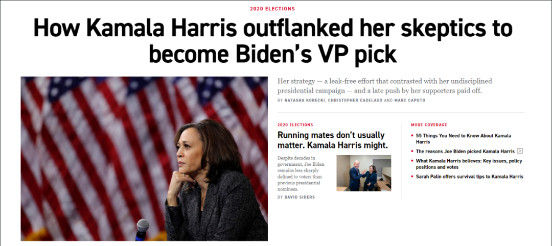 媒体相当看好拜登与哈里斯的组合,纷纷给予高度评价。《华盛顿邮报》称拜登此举“创造了历史”;美国消费者新闻则认为,哈里斯是拜登最稳妥的选择。