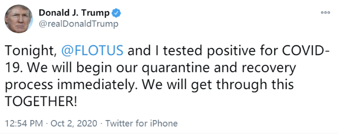总结起来,逻辑就是:特朗普“得新冠”汇集亿万眼球;选民关注特朗普隔离;隔离后,特朗普正常掌权并每天发推数十条,向公众传递他“夺冠”后的生活正常,一点不难受;两周后特朗普痊愈生龙活虎出现在公众面前,然后告诉大家新冠不过是个大号流感,很好治愈,接下来他将推出更加有力的经济刺激话;在大家还不明就里的时候,他获得了舆论的认可,支持率大增,士气大涨,接着就是总统选举的投票······
