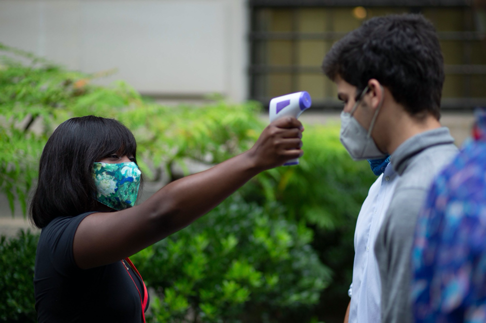 8月29日,在美国纽约大都会艺术博物馆,工作人员为参观者测量体温。