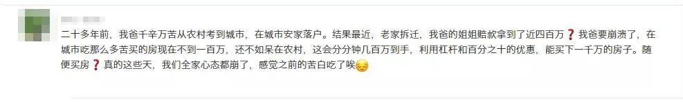 我猜,这篇文章一开头提到的那个姑娘的一家,虽然失去了在农村拿拆迁补偿的机会,但是在大城市,一定得到了更丰富的经历,更方便的生活,更多的机会和人脉,更精彩的人生。