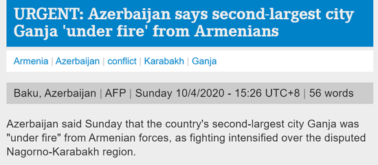 据俄媒转引法新社10月4日的报道,阿塞拜疆国防部在其官网发布声明称,该国第二大城市占贾遭亚美尼亚军队攻击,该城市人口约33万多人。另外,阿方还称,其他几个平民地区也遭到了亚方火箭弹和炮弹的袭击。据称,这座城市并不靠近前线。不过,亚美尼亚国防部否认发射了导弹。