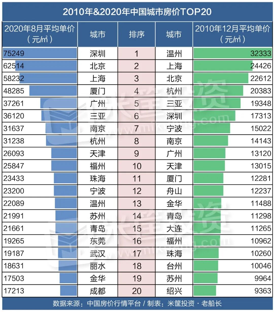 这里面不仅有哈尔滨这样的省会城市,也有榆林、大庆这样典型的资源型城市。而其中,东北城市就占了接近一半之多,房价是经济的反应,可见一斑。垫底的温州,10年来房价跌了31%。温州也成为这十年间,中国房地产市场“牛熊交替”的见证者。2010年前后,温州房价涨到最高峰的3万多,与杭州一起成为“楼市双雄”,超过北上广深四大一线城市,高居全国榜首。但2011年,国家出手调控楼市,“新国八条”给了楼市一拳重击。银根收紧、贷款难度增加,加上民间借贷崩盘导致的高杠杆炒房客爆仓,温州楼市开始直线暴跌。直到2014年8月解除限购政策,温州楼市经历了连续36个月下跌。3年时间温州房价下跌约40%,部分高档楼盘价格下跌超过50%。此后,温州房价才开始缓慢爬升,到今天的2万元左右。而10年前与当下中国房价最高的20个城市对比,更能看出时代变迁。