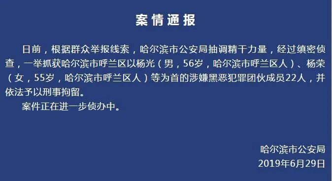 同年6月29日,哈尔滨市公安局宣布打掉一涉嫌黑恶势力团伙,抓获呼兰区以杨光(男,56 岁,呼兰区人)、杨荣(女,55 岁,呼兰区人)等为首的涉嫌黑恶犯罪团伙成员 22 人,依法予以刑事拘留。