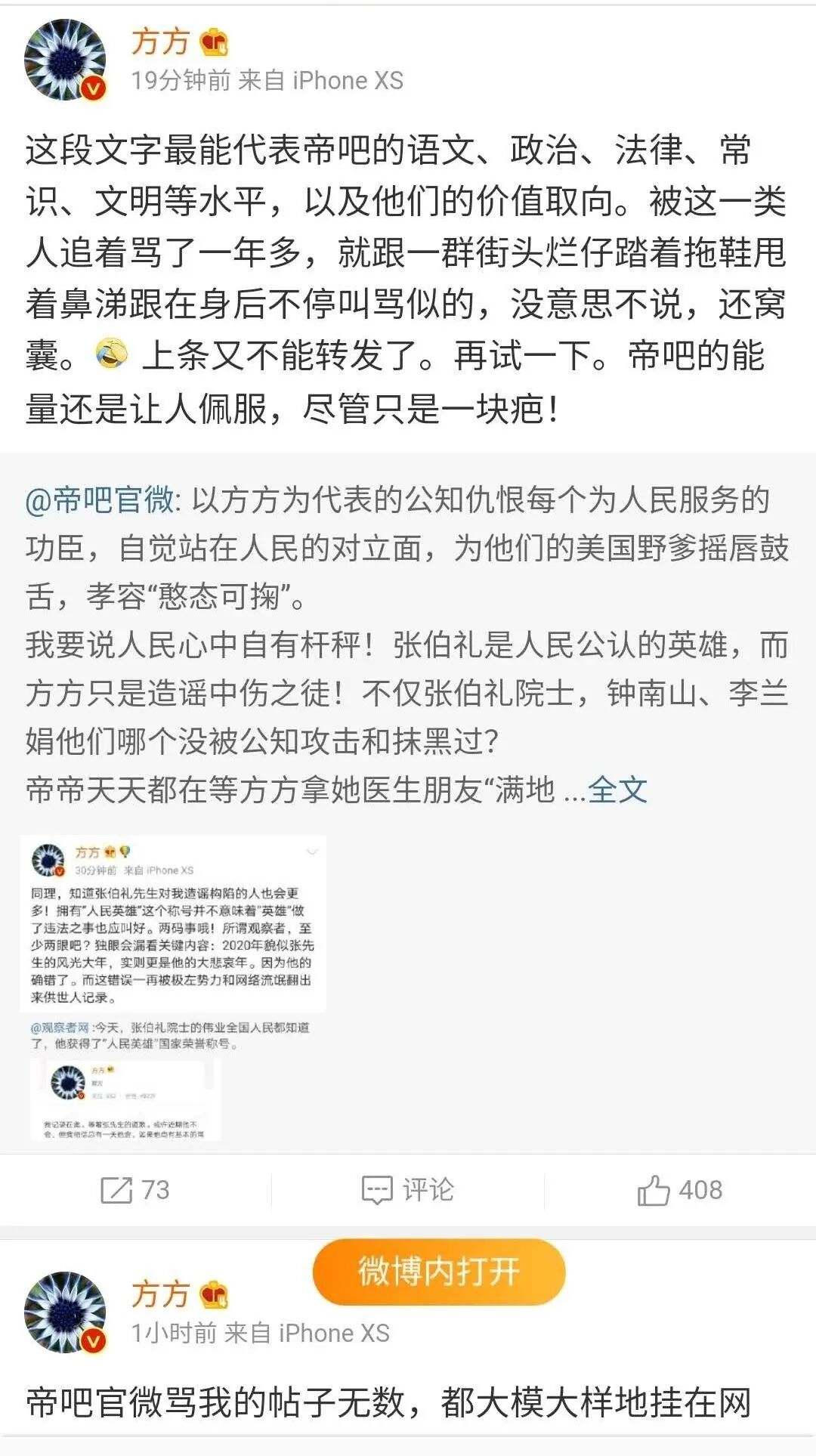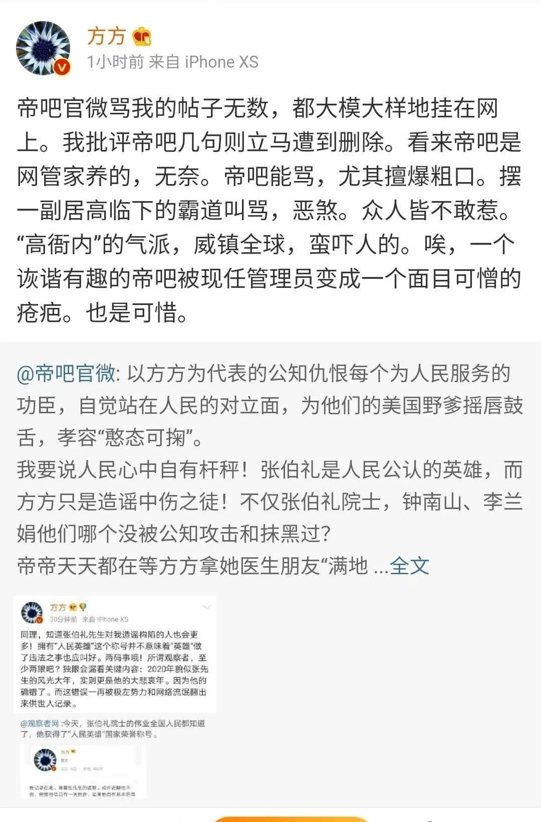 方方大概是从懂王的“诈病”中获得了灵感,反下不管好歹,先乱咬一阵再说。咬完了影响力巨大的观察者网,方方又张嘴对准了号称百度第一吧的帝吧,连发了两条微博,一顿狠咬。反正就是要搞事儿,搞大事儿,引起洋主子大人的重视!那意思就是说,“虽然我方方是被中国网民痛打的落水狗,但是我还没死,我还能咬人!”