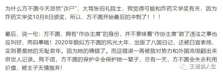 10月8日炸药奖马上就要颁发了,方方估计也是狗急乱咬人。虽然说方方日记在海外已经出版了八种语言的版本,号称八国联军版本的方方日记。但是因为欧美国家的战疫不力,方方日记在海外并不怎么受到民众欢迎,虽然有包括像《经济学人》、《路透社》这样的顶级媒体和学术期刊的加持,但是方方得奖的呼声似乎还不够高。