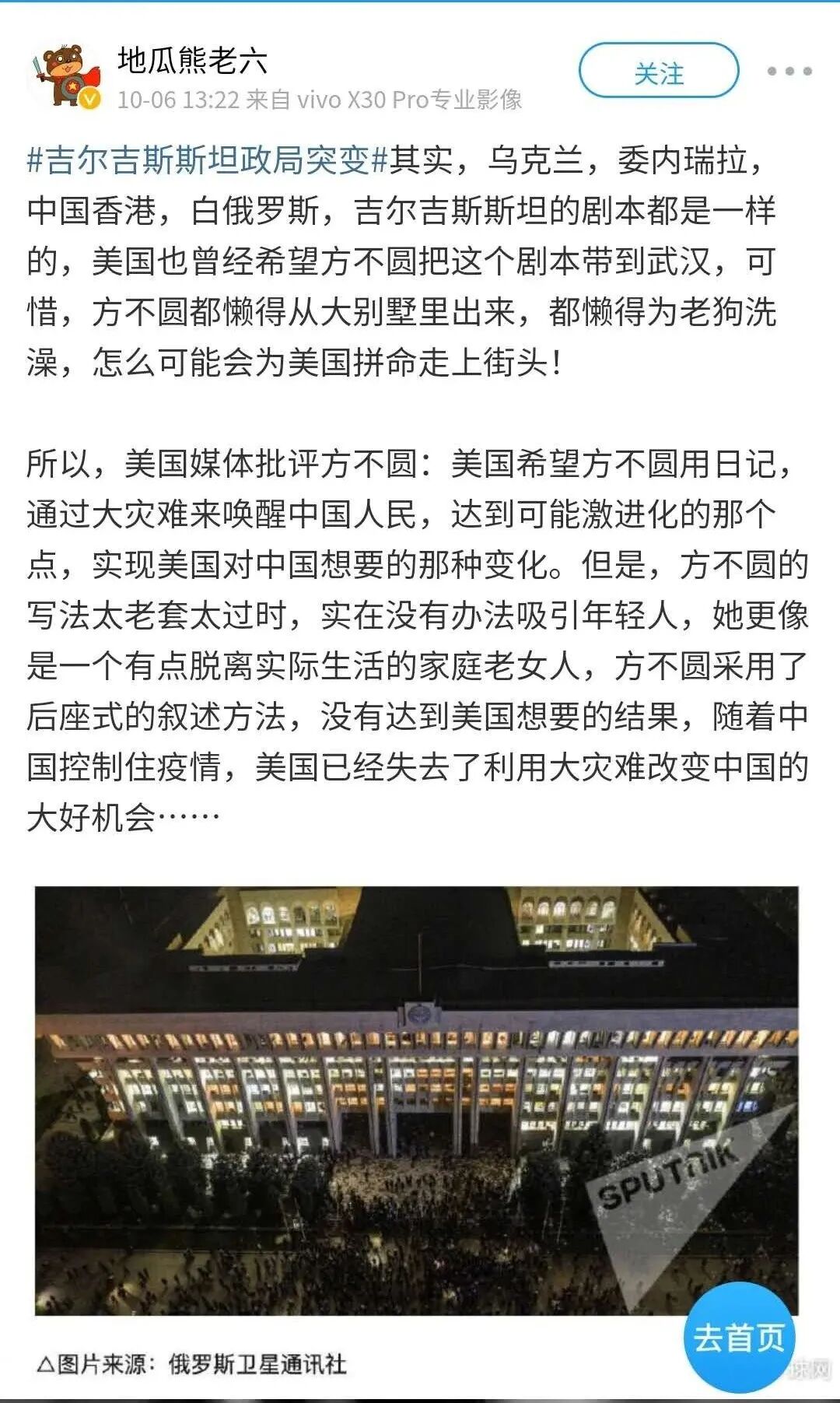 路不平,有人铲,事不平有人管。你方方包藏祸心,干的祸国殃民的勾当,别以为中国人老百姓瞎了眼。人民群众的眼睛是雪亮的,这一次亚美尼亚与阿赛拜疆的战争,以及白俄罗斯、吉尔吉斯坦的颜色革命,再一次提醒了中国老百姓,你方方到底想干什么!造谣惑众,咬完战疫的人民英雄,又来咬观察者网,咬完观察者网,又来咬帝吧几千万的中国青年,像你这种历史的垃圾,从哪来的回哪去!