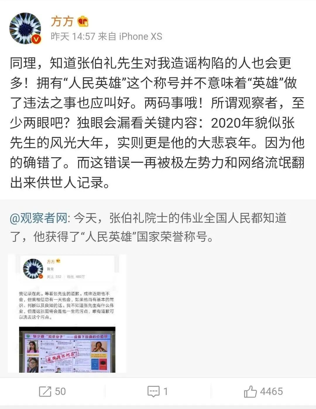 “同理,知道张伯礼先生对我造谣构陷的人也会很多!拥有‘人民英雄’这个称号并不意味着‘英雄’做了违法之事也应叫好。两码事哦!所观察者,至少两眼吧?独眼会漏看关键内容:2020年貌似张先生的风光大年,实则更是他的大悲哀年。因为他的确错了。而这错误一再被极左势力和网络流氓翻出来供世人纪录。”