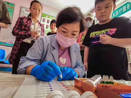 2020年8月21日,山西运城盐湖区潞村街社区卫生服务站医护人员正在为准备开学的孩子们采集血样进行乙肝检测。