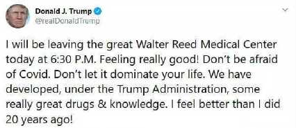 第一件事,他在出院前就发推说:下午六点半出院,他感觉非常棒!让大家不要害怕新冠,不要让新冠主导生活。在特朗普政府的领导下,美国已经研发了非常好的药物,了解了很多知识。他最后还说,他比20年前感觉还好!