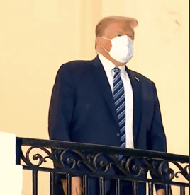 第二件事,当他乘坐直升机回到白宫后,他干的第一件事就是摘掉口罩。他为什么要摘口罩?就是在告诉公众,他已经健康了、恢复了,他很好,他没事!同时他还发了视频,视频内容是告诉美国公众,他领导的美国政府有最好的医疗设备和药物,不要害怕新冠,不要让新冠控制你,而且疫苗也要问世了。