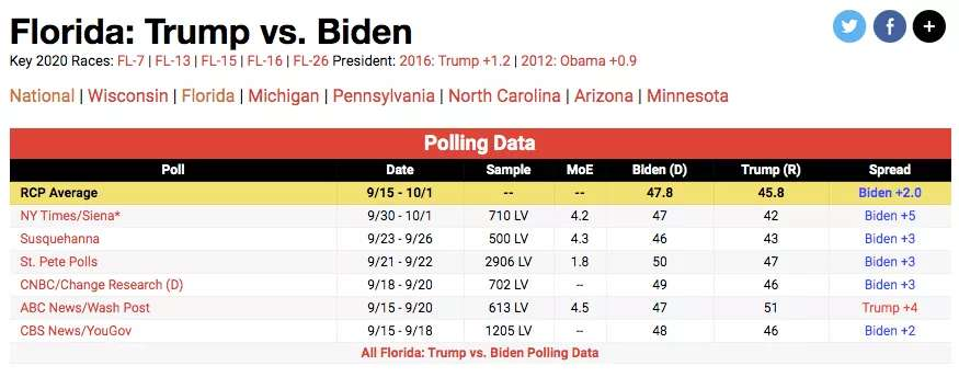 虽然拜登看起来大大领先特朗普,但实际领先幅度都很小,最大的一个州领先5个点,其他都是两个点或三个点。这个领先点数,可以说差距非常小,对选举结果影响可以用微乎其微来形容。到底谁会赢得选举,这个支持率差距不影响结果。