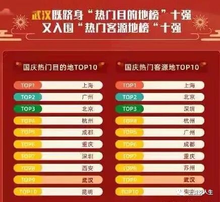 武汉作为今年疫情爆发的中心,在今年国庆长假双双荣登“热闹目的地榜”和“热闹客源地榜”第九名!我想年初那些悲观绝望的人们如今可以扬眉吐气了,为我们伟大的祖国,为我们英雄的人民,尤其是我们披甲奋战在武汉一线的白衣天使献上自己的膝盖了!